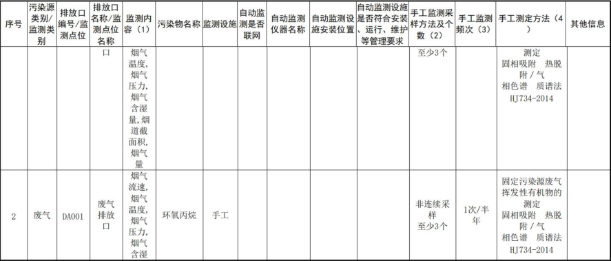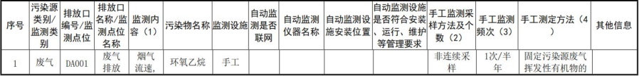 1 | 廢氣 | 廢氣排口 | 環(huán)氧乙烷 | 1 次/半年 | HJ732-2014 | |