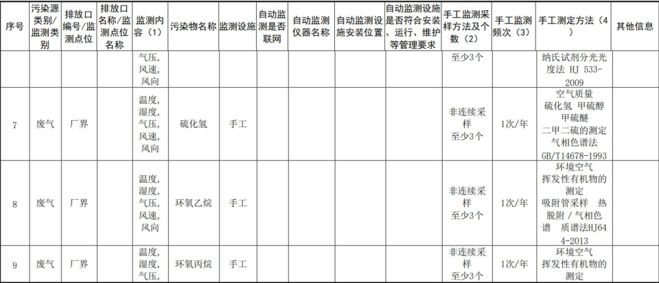 序號 | 污染源類型 | 監(jiān)測點位 | 監(jiān)測項目 | 監(jiān)測頻次 | 測定方法 | 備注 |