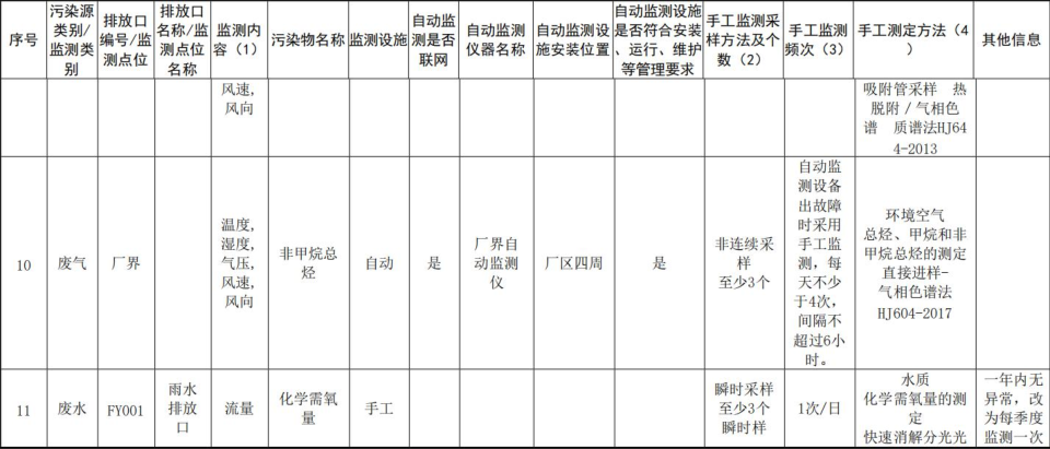 三、企業(yè)自行監(jiān)測開展情況說明我公司自行監(jiān)測手段采用手工監(jiān)測+自動監(jiān)測相結(jié)合,開展自動監(jiān)測的項目有廢氣中的甲烷、非甲烷總烴及 VOC,其他未開展自動監(jiān)測的項目采用手工監(jiān)測。 我公司手工監(jiān)測委托第三方檢測機構(gòu)進行監(jiān)測,監(jiān)測內(nèi)容包括有組織廢氣和無組織廢氣。